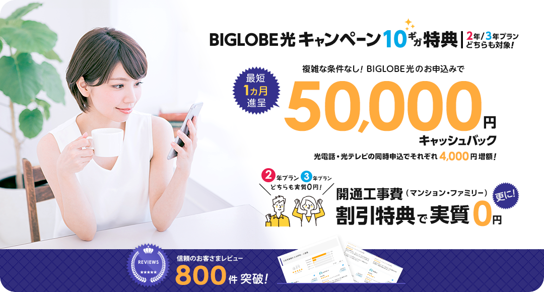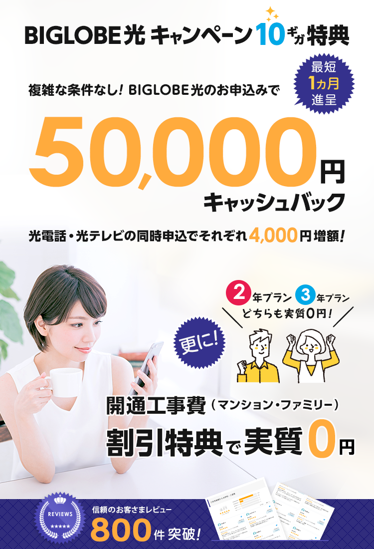 ※ BIGLOBE光のお申込みでおトクなキャッシュバック特典を進呈!2年・3年プランどちらも対象!10ギガ申込なら「50,000円キャッシュバック」、1ギガ申込は「30,000円キャッシュバック」です。更に、回線工事費が実質0円になる特典も!キャンペーンの詳細は「 BIGLOBE光キャンペーン一覧 」をご確認ください。