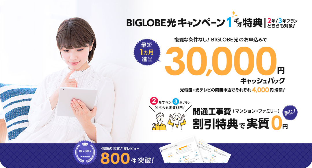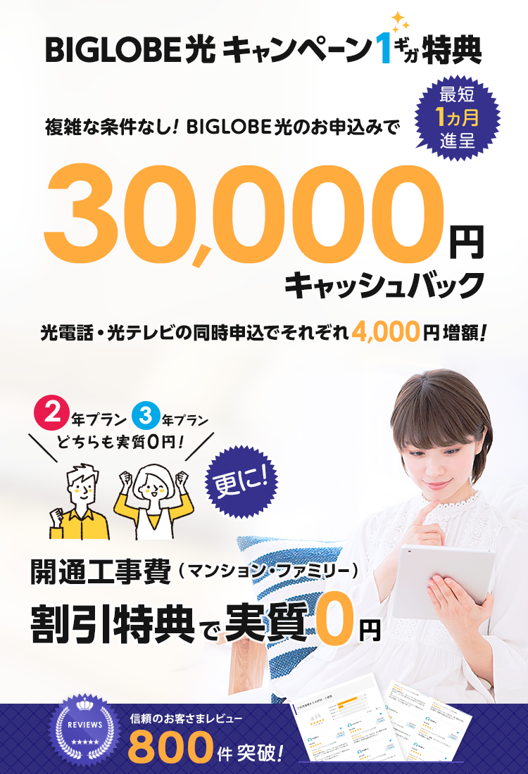 当BIGLOBE光キャンペーンサイトからのお申し込みで、キャッシュバック特典や初期工事費実質0円特典(1ギガサービス)の対象になります。おトクな特典をもらってBIGLOBE光をはじめるチャンスです♪